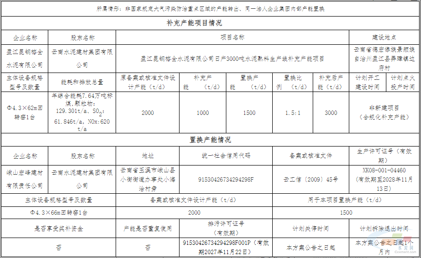 峨山宏峰建材有限责任公司一条2000t/d水泥熟料线中的1500t/d用于该项目置换产能,计划在本方案公告之日起1个月内拆除退出。