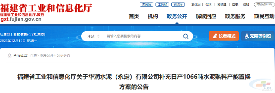 12月15日,福建省工业和信息化厅发布关于华润水泥(永定)有限公司补充日产1066吨水泥熟料产能置换方案的公告。