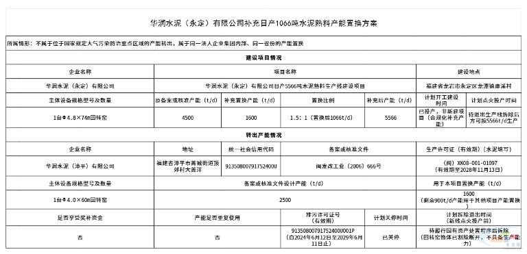 华润水泥(永定)有限公司4500t/d熟料线补充1066t/d产能,置换比例1.5:1,产能指标来源为华润水泥(漳平)有限公司2500t/d熟料线中的1600t/d产能。
