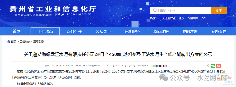 9月19日,贵州省工信厅发布“关于遵义海螺盘江水泥有限责任公司2#日产4500吨熟料新型干法水泥生产线产能转出方案的公示”。