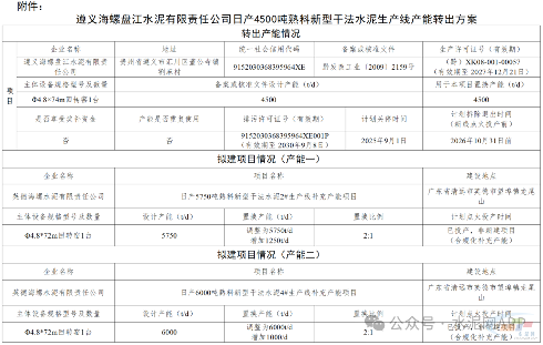 置换方案显示,遵义贵州盘江水泥一条4500t/d生产线产能转出,其中2500t/d产能用于补充英德海螺水泥2#生产线,2000t/d产能补充英德海螺水泥4#生产线,置换比例均为2:1。