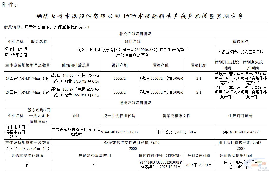 根据《水泥玻璃行业产能置换实施办法(2024年本)》等文件要求,铜陵上峰水泥股份有限公司1#、2#水泥熟料生产线(产能均为5000t/d)通过补产能方式将产能增加到5500t/d,置换产能来自梅州市梅雁旋窑水泥有限公司,置换比例为2:1。产能调整置换方案公示期间收到的反馈情况,已按照程序核实。现将产能调整置换方案予以公告。