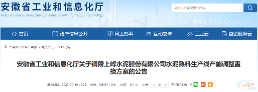 近日,安徽省工业和信息化厅发布了关于铜陵上峰水泥股份有限公司水泥熟料生产线产能调整置换方案的公告。