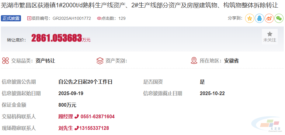 9月19日,据安徽省产权交易中心网站信息显示,安徽省芜湖市繁昌区荻港镇1#2000t/d熟料生产线资产、2#生产线部分资产及房屋建筑物、构筑物整体拆除转让,转让底价为2861.053683万元。