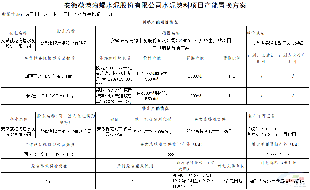 此前2025年1月9日,芜湖市工业和信息化局曾发布关于荻港海螺水泥股份有限公司水泥熟料生产线产能置换方案的公示。(详见:荻港海螺水泥熟料生产线产能置换方案公示!)