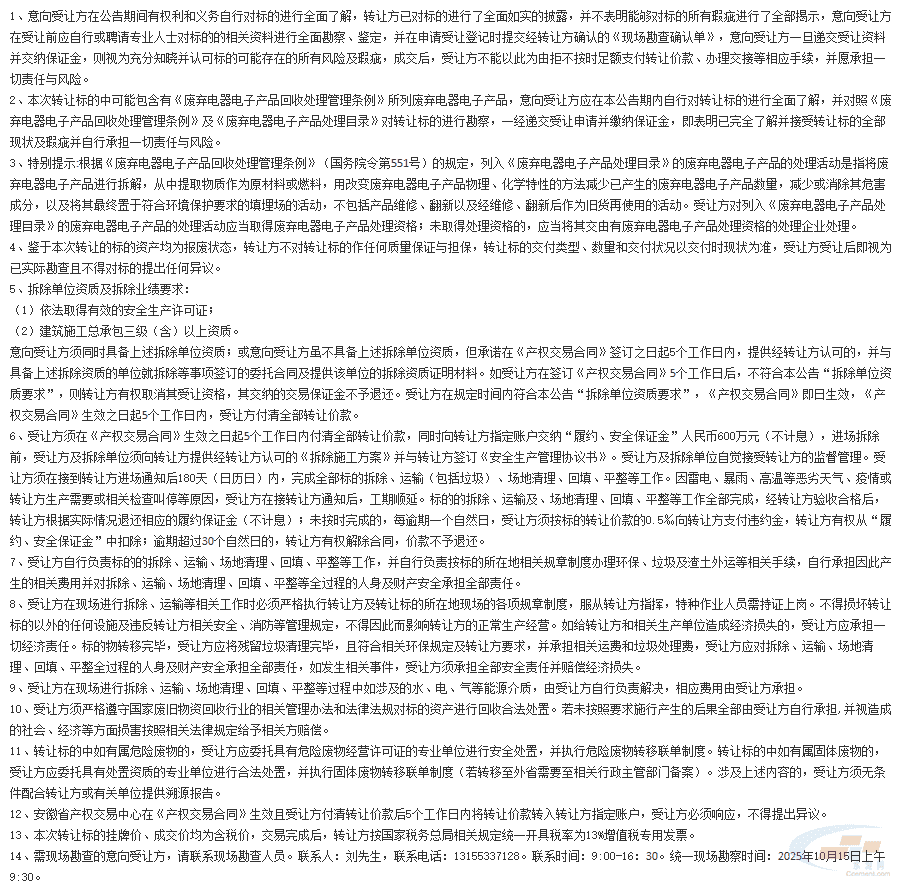 本次转让标的为芜湖市繁昌区荻港镇1#2000t/d熟料生产线资产、2#生产线部分资产及房屋建筑物、构筑物整体拆除,标的资产主要为PH锅炉、辊式原料磨、回转窑等机器设备、房屋建筑物、构筑物等,转让标的位于安徽省芜湖市繁昌区荻港镇安徽荻港海螺水泥股份有限公司厂区内。以下为重要信息披露: