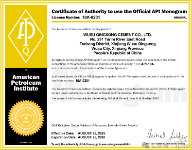 近日,乌苏青松公司传来喜讯,其油井水泥产品经美国石油学会(API)严格审核,成功获得API Spec 10A规范认证,正式拿到服务油气田固井工程的“国际通行证”。