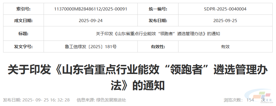 近日,山东省工业和信息化厅、山东省发展和改革委员会、山东省市场监督管理局三部门印发《山东省重点行业能效“领跑者”遴选管理办法》。