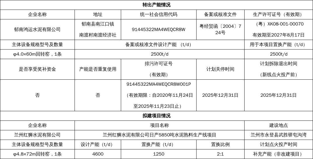 郁南鸿运水泥有限公司日产2500吨水泥熟料产能出让方案