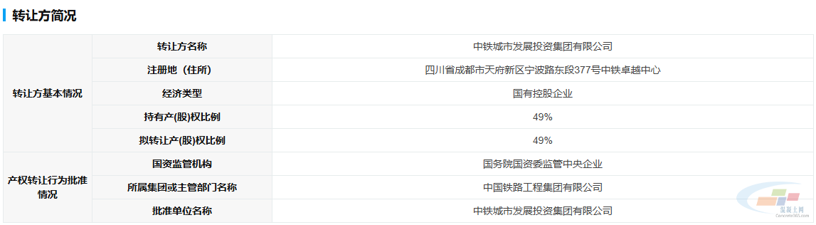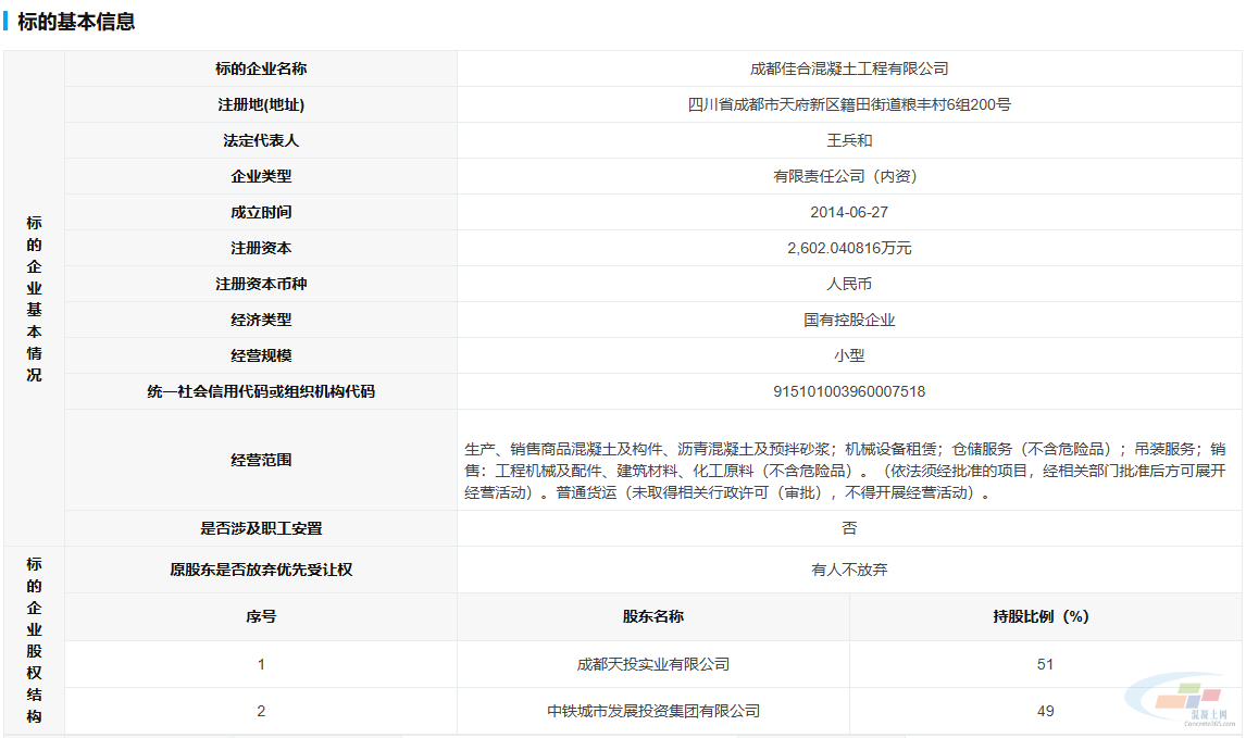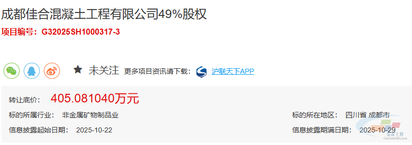 10月22日,据某产权交易平台信息显示,成都佳合混凝土工程有限公司49%股权转让,转让底价为405.08104万元,标的对应评估值为506.3513万元。