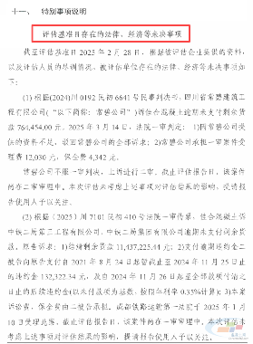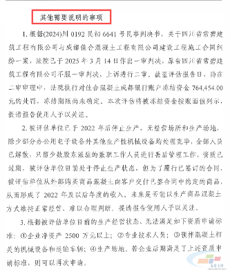 此外评估报告特别说明,成都佳合混凝土工程有限公司已于2022年后停止生产,目前处于停止生产状态,无经营场所和生产场地除少部分办公用电子设备外其他生产性机械设备均处理完毕,但为了履行已签订的合同,被评估单位从外部购买商品混凝土向客户交付已签合同中约定的商品,从而形成了2022年及以后年度的收入。未来是否能以生产商品混凝士方式维持正常经营,难以合理判断。提请报告使用人予以关注。