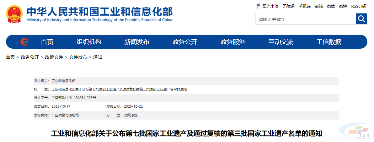 10月22日,国家工业和信息化部发布关于第七批国家工业遗产及通过复核的第三批国家工业遗产名单的通知。