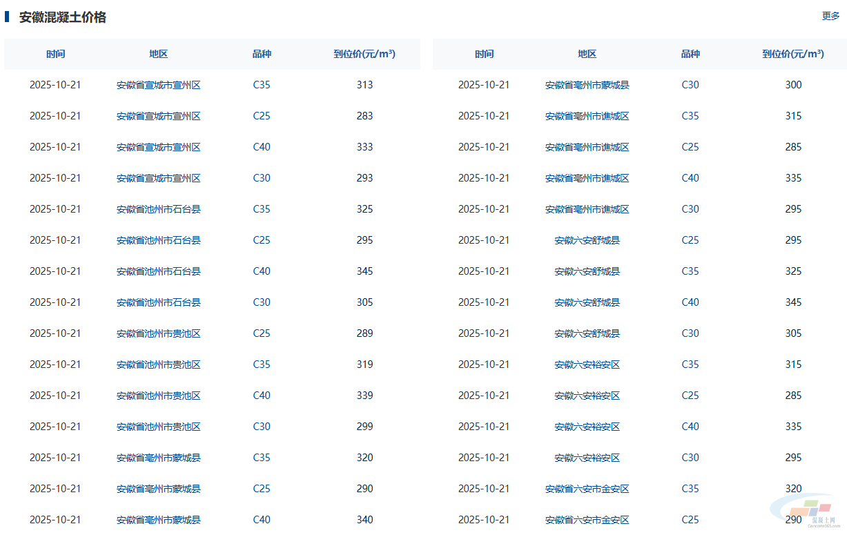 中国混凝土网行情通显示,2025年10月22日安徽省热门城市C30混凝土市场价格如下: