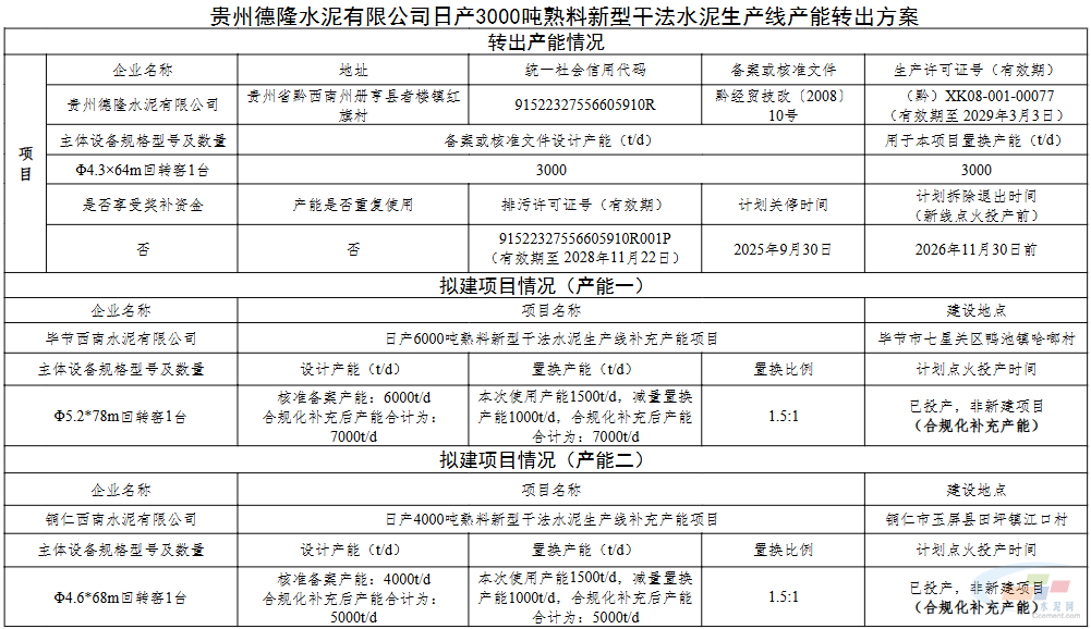 贵州德隆水泥3000t/d水泥熟料线产能转出方案公示