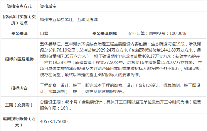 项目名称:五华县琴江、五华河水环境综合治理工程勘察设计施工总承包及运营维护服务