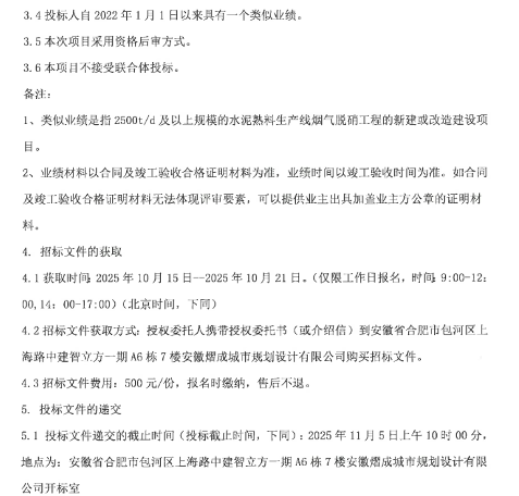 投标人除了有良好的信誉及相关资质外,业绩方面投标人自2022年1月1日以来需具有一个类似业绩,即2500t/d及以上规模的水泥熟料生产线烟气脱硝工程的新建或改造建设项目业绩。