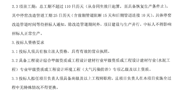 项目总工期不超过110日历天(从合同生效日起算,至具备恢复生产条件止),其中停窑改造管道工期25日历天(含前期管道阻断15天和后期管道连接10天)。具体停窑改造管道时间等待招标人通知,除改造管道期间外,项目建设与生产并行,中标人不得影响招标人正常生产。