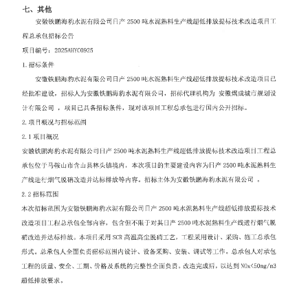 安徽铁鹏海豹水泥2500t/d熟料线超低排放提标技改项目总包招标!