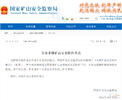 10月10日,国家矿山安全监察局公布非煤矿山灾害防控要点。