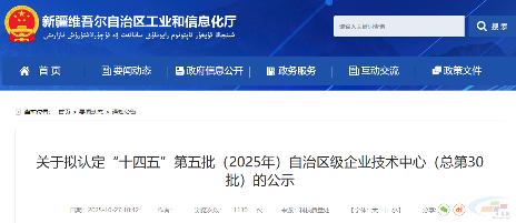 10月27日,新疆维吾尔自治区工业和信息化厅发布关于拟认定“十四五”第五批(2025年)自治区级企业技术中心(总第30批)的公示。公示期为2025年10月27日至31日(5个工作日)。