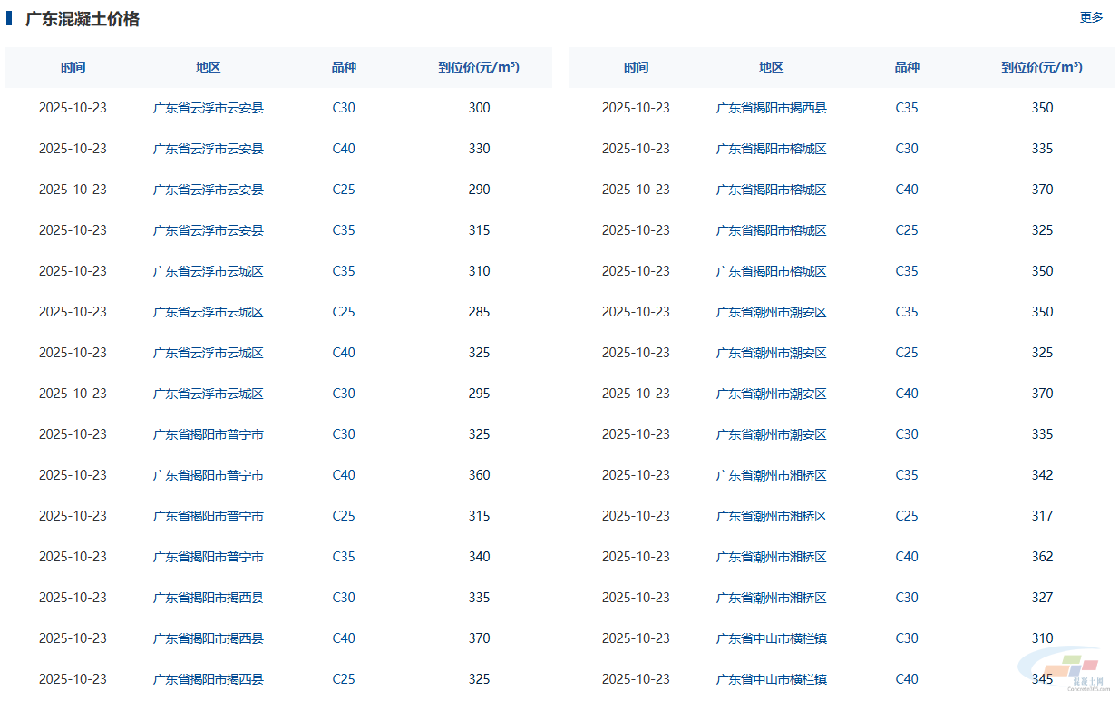 中国混凝土网行情通显示,2025年10月24日广东省热门城市C30混凝土市场价格如下: