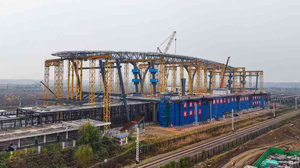 11月8日,中国中铁旗下中铁建工承建的(天)津潍(坊)高铁东营南站首榀钢屋架拼装滑移作业顺利完成。