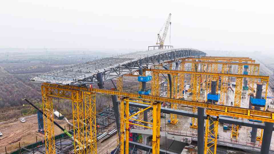 与传统跨线施工需频繁占用铁路“天窗点”、干扰运输不同,该项目应用的“跨运营铁路大跨度钢屋盖分块滑移施工技术”实现“永临结合”的智慧施工。“通过在地面完成主要拼装工作,再进行高空滑移,我们避免了对下方德大线运营的干扰,也无需大型机械跨线高危作业。”现场技术负责人介绍。这一技术不仅提升了施工安全性,还将整体工期提前20至30天。