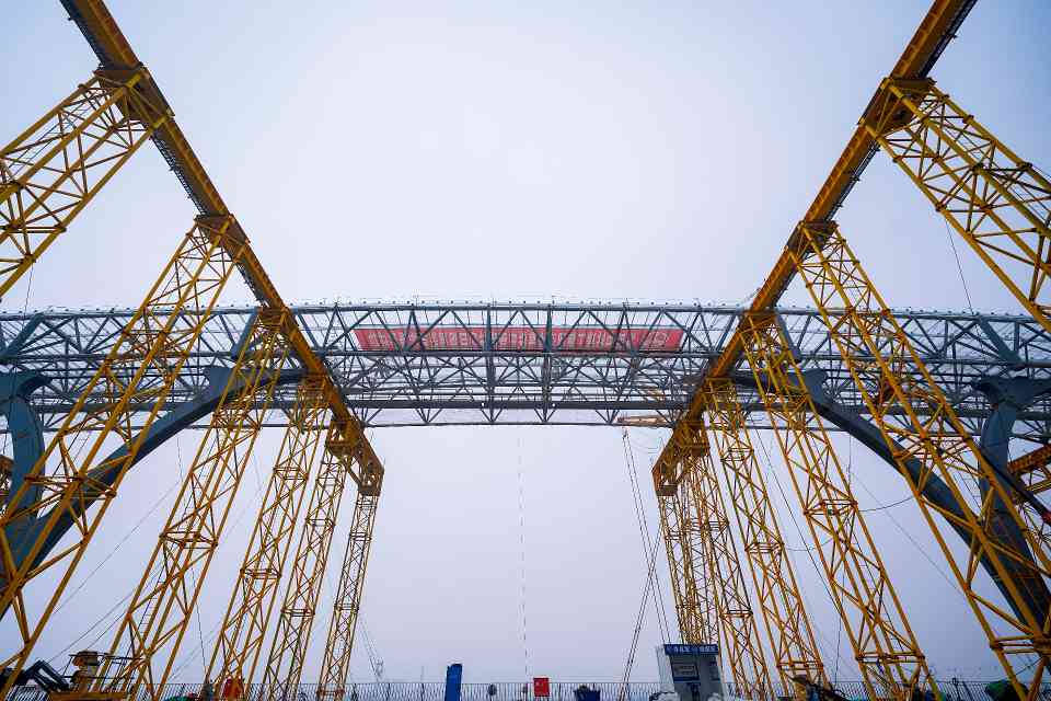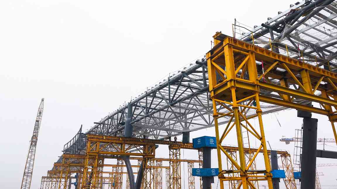 项目团队创新应用“地面拼装+高空对接+高空滑移”的综合施工工艺。本次滑移的首榀钢桁架重约300吨,跨度约195米,整个滑移过程历时约2小时。