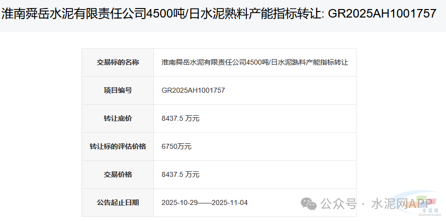 9月,淮南舜岳水泥有限责任公司挂牌转让4500t/d水泥熟料产能指标,底价为8437.5万元。