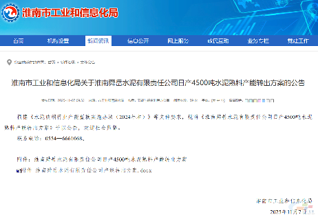 11月7日,安徽省淮南市工信局发布“关于淮南舜岳水泥有限责任公司日产4500吨水泥熟料产能转出方案的公告”。