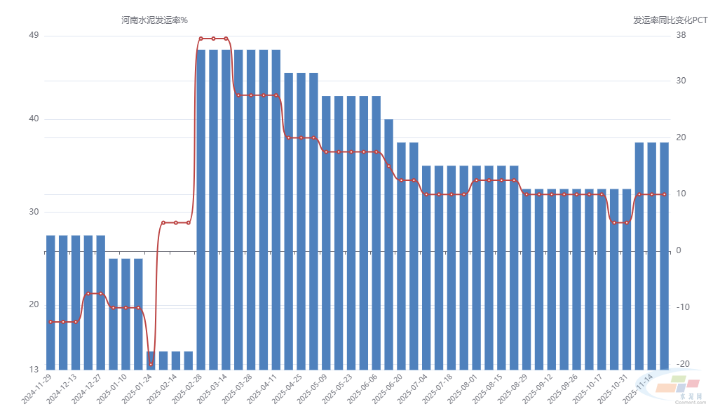 中国水泥网行情数据中心讯:据市场了解,河南地区自11月15日起错峰停窑,产量收缩,加之近期天气适宜施工,下游市场需求有所回升,企业涨价意愿强烈,推动上调水泥20元/吨。