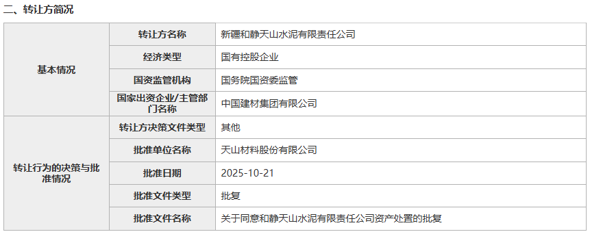 本次转让标的包括机械设备、房屋建筑等。2025年3月,新疆维吾尔自治区工业和信息化厅发布公告,新疆和静天山水泥有限责任公司2024年9月置换至布尔津天山水泥有限责任公司的Φ3.2×50米(日产1000吨)水泥熟料生产线已关停拆除。