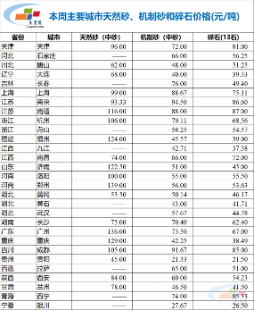 水泥网数据:天然砂、机制砂、碎石价格统计(11.29-12.5)