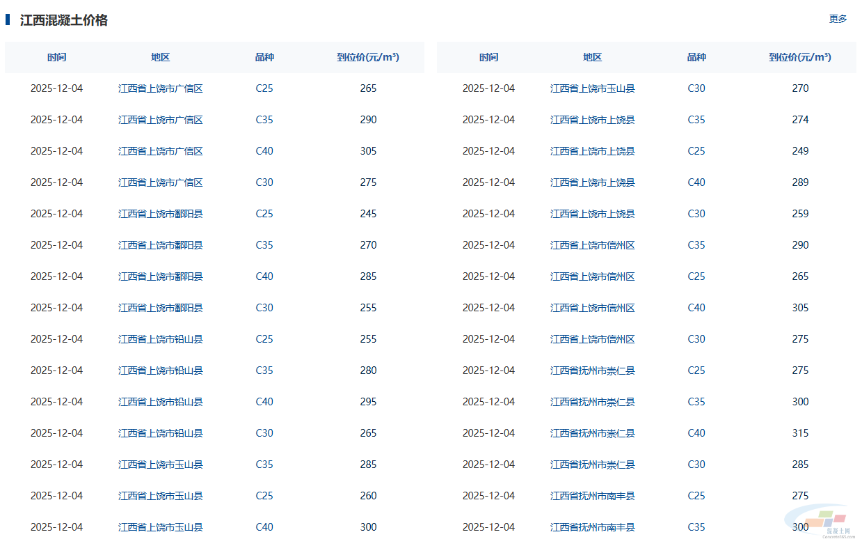 中国混凝土网行情通显示,2025年12月5日江西省热门城市C30混凝土市场价格如下: