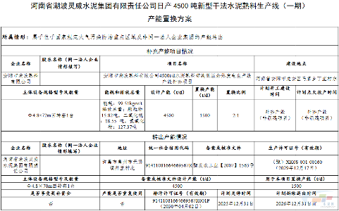剩余1500t/d产能用于补充安阳市湖波熟料公司一条4500t/d熟料生产线,补充后产能5250t/d,置换比例2:1。