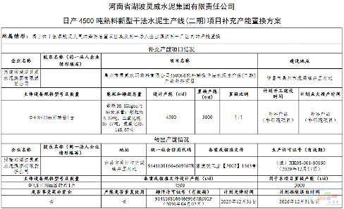 置换方案显示,河南省湖波灵威水泥退出一条4500t/d熟料生产线,其中3000t/d产能用于补充同企业另一条4500t/d熟料生产线,补充后产能7500t/d,置换比例1:1;