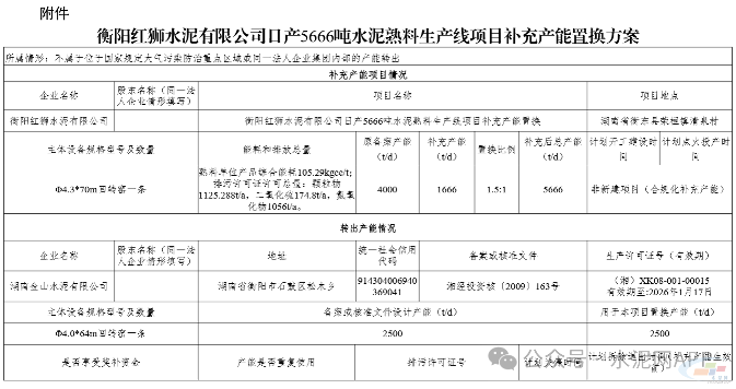 置换方案显示,衡阳红狮水泥4000t/d熟料生产线补充产能1666t/d,补充后产能5666t/d,退出产能来自湖南金山水泥一条2500t/d熟料生产线,置换比例1.5:1。