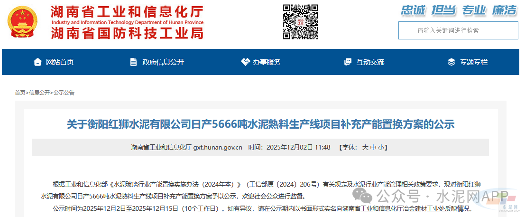 12月2日,湖南省工信厅发布“关于衡阳红狮水泥有限公司日产5666吨水泥熟料生产线项目补充产能置换方案的公示”。