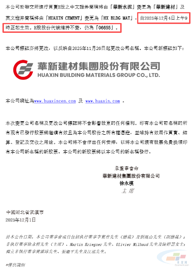 华新水泥H股中文简称自12月4日起变更为“华新建材”