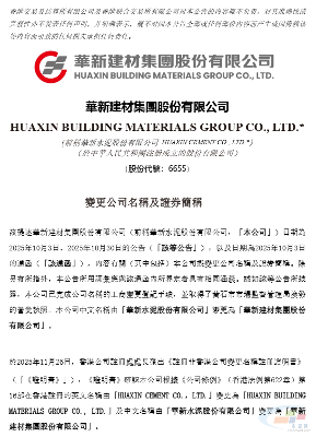 12月1日,华新建材发布公告称,公司已完成名称变更,原名“华新水泥股份有限公司”更改为“华新建材集团股份有限公司”。此变更已于2025年11月26日获得香港公司注册处的确认,并将于2025年12月4日上午9时正生效。