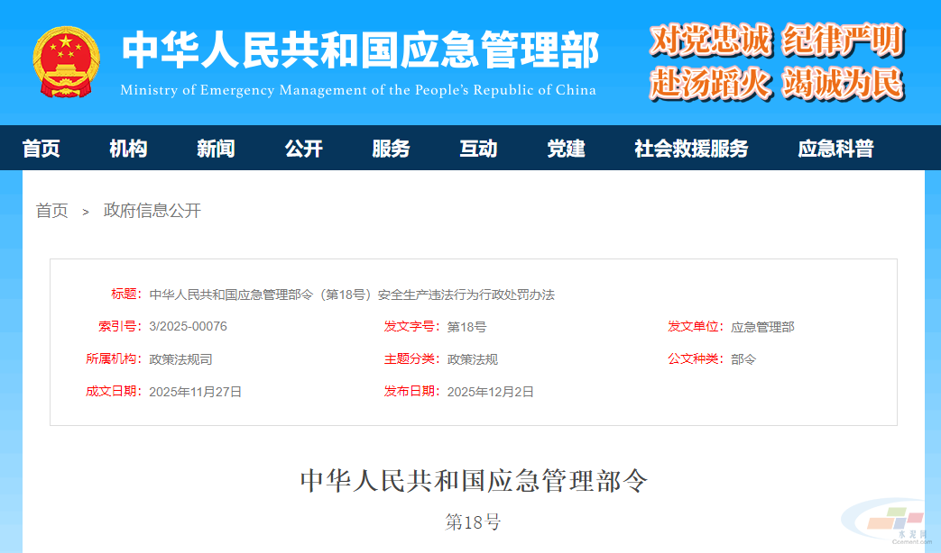 12月2日,中华人民共和国应急管理部公布《安全生产违法行为行政处罚办法》,自2026年2月1日起施行。原文如下: