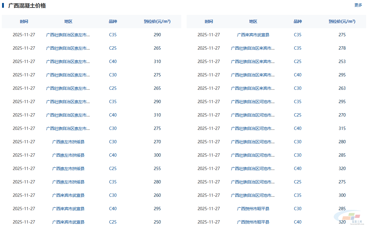 广西C30混凝土的市场价格区间在250-300元/方之间,显示出一定的地区差异。