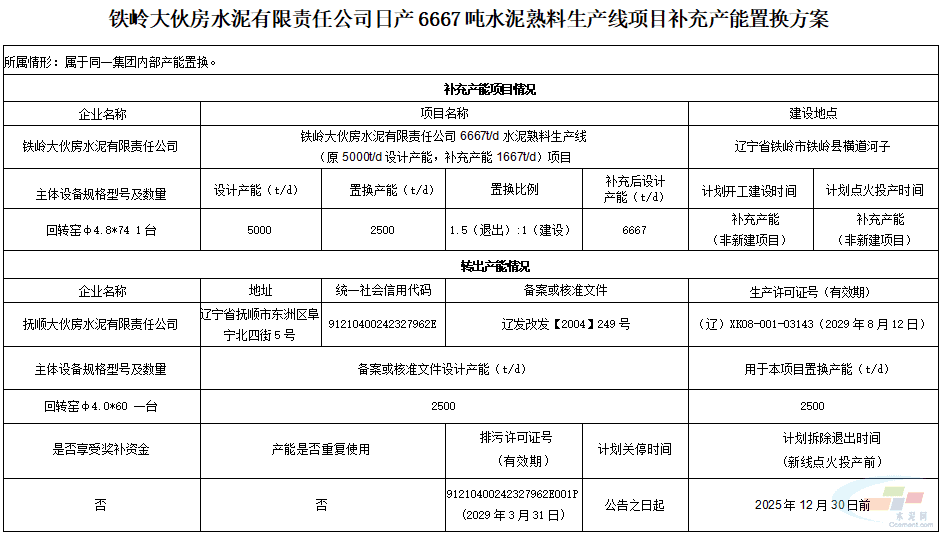 置换方案内容显示,铁岭大伙房水泥有限责任公司6667t/d水泥熟料生产线项目原设计产能5000t/d,补充产能1667t/d来自抚顺大伙房水泥有限责任公司2500t/d水泥熟料线,置换比例为1.5:1。