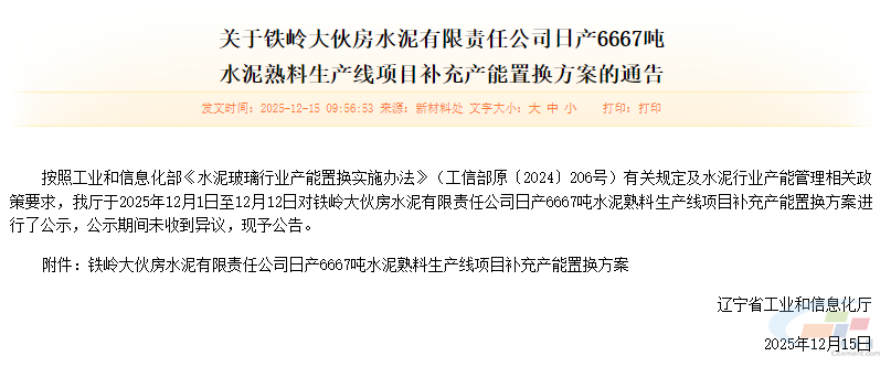 12月15日,辽宁省工业和信息化厅发布关于铁岭大伙房水泥有限责任公司日产6667吨水泥熟料生产线项目补充产能置换方案的通告。