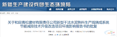 12月11日,新疆生产建设兵团生态环境局发布关于和田青松建材有限责任公司新型干法水泥熟料生产线烧成系统节能减排技术升级改造项目环境影响报告书的批复。